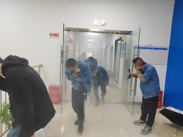 消防疏散演練模擬現(xiàn)場。警報聲響起,全體員工迅速行動,彎腰低頭、捂住口鼻,按預(yù)定路線有條不紊穿過“火災(zāi)煙霧現(xiàn)場”。整個過程中,員工嚴(yán)格遵守要求,冷靜應(yīng)對,展現(xiàn)良好應(yīng)急反應(yīng)能力。