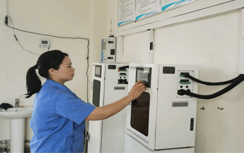 為了確保各個環(huán)節(jié)污水檢測指標正常,李紅每隔2小時就對進出口在線監(jiān)測室的在線設(shè)備、各類藥劑進行巡視,查看數(shù)據(jù)是否上傳成功,及時處理應(yīng)急突發(fā)問題。水廠占地達130畝,一遍巡視下來就會花上1小時左右。當進口取樣管堵塞時,她帶領(lǐng)班組成員積極協(xié)助維修科等工作人員對取樣設(shè)備進行清理。為了減少進口監(jiān)測設(shè)備吸到雜質(zhì)堵塞檢測設(shè)備的管路,她每隔1-2小時還要對進水取樣口篩網(wǎng)進行沖洗,從來不怕臟、不怕累。